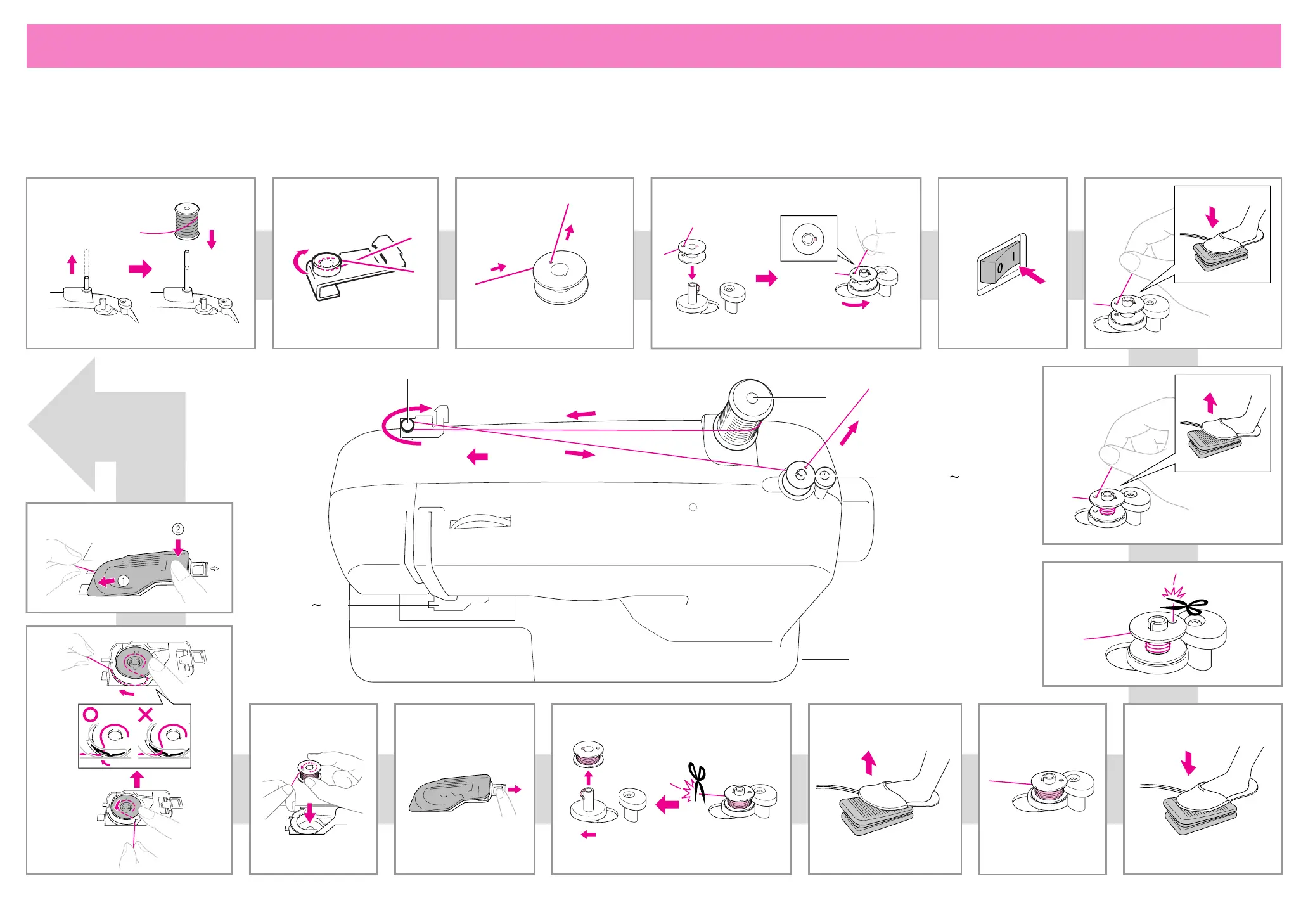 Quick Start Guide 1 – Preparing the bobbin thread – / Guide de démarrage rapide 1 – Préparation du fil de la canette – / Kurzanleitung 1 – Vorbereitung des Spulenfadens –