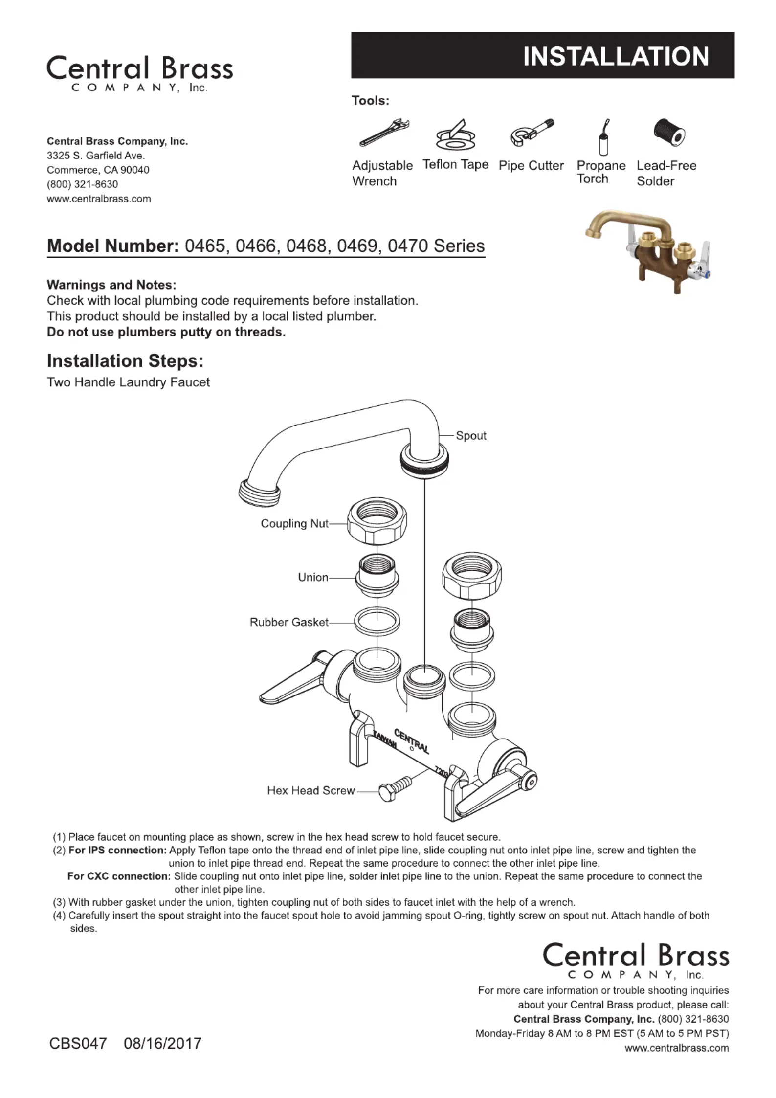 Bekijk gratis de handleiding van Central Brass 0468 (1 pagina’s), behorend tot de categorie Kraan. Deze gids werd als nuttig beoordeeld door 5 mensen en kreeg gemiddeld 5.0 sterren uit 4 reviews. Heb je een vraag over Central Brass 0468 of wil je andere gebruikers van dit product iets vragen? Stel een vraag