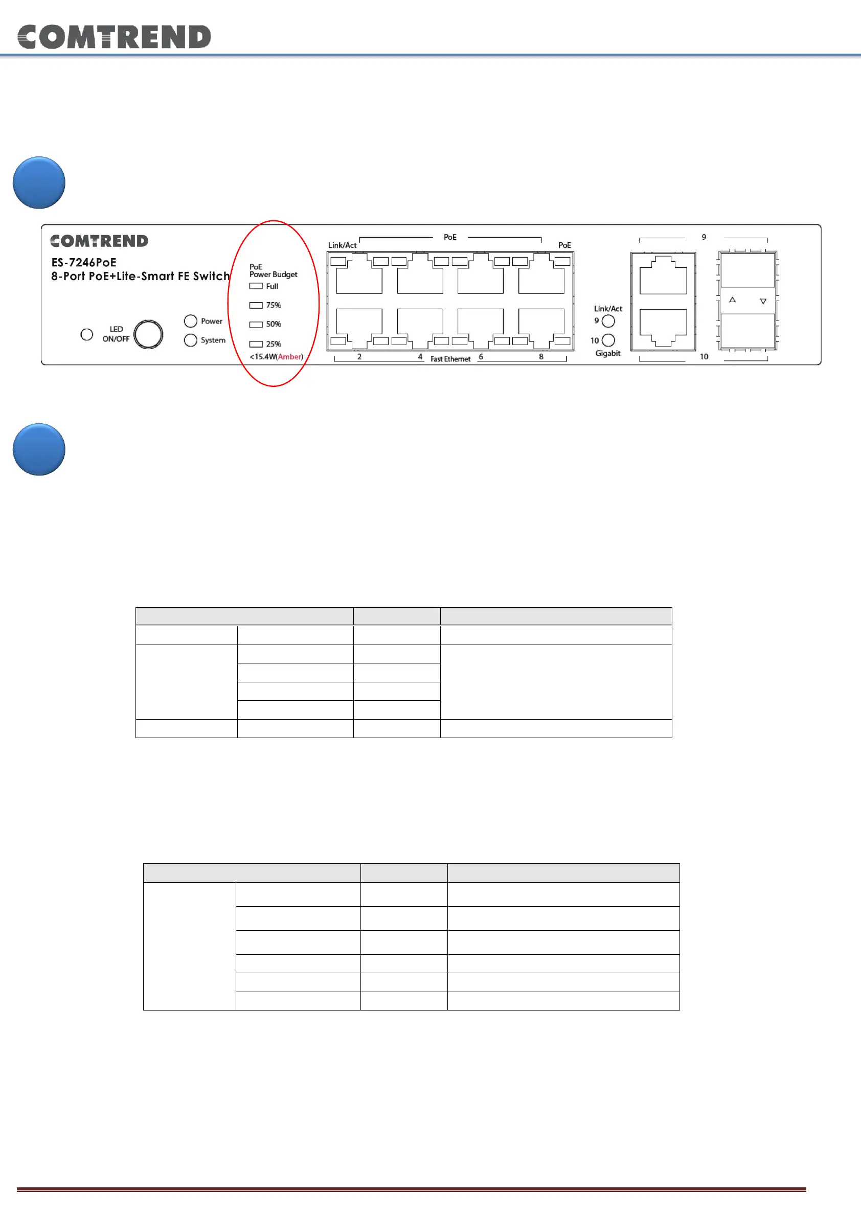 IEEE 802.3af/at. Use the "PoE Power Budget" LED indicators on the front panel to visualize the