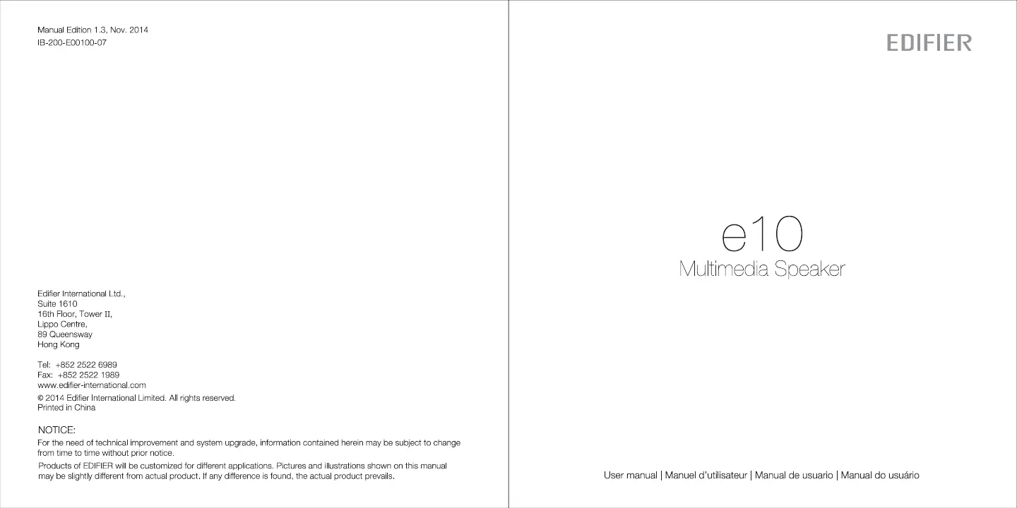 Bekijk gratis de handleiding van Edifier e10 (15 pagina’s), behorend tot de categorie Speaker. Deze gids werd als nuttig beoordeeld door 9 mensen en kreeg gemiddeld 4.5 sterren uit 9 reviews. Heb je een vraag over Edifier e10 of wil je andere gebruikers van dit product iets vragen? Stel een vraag