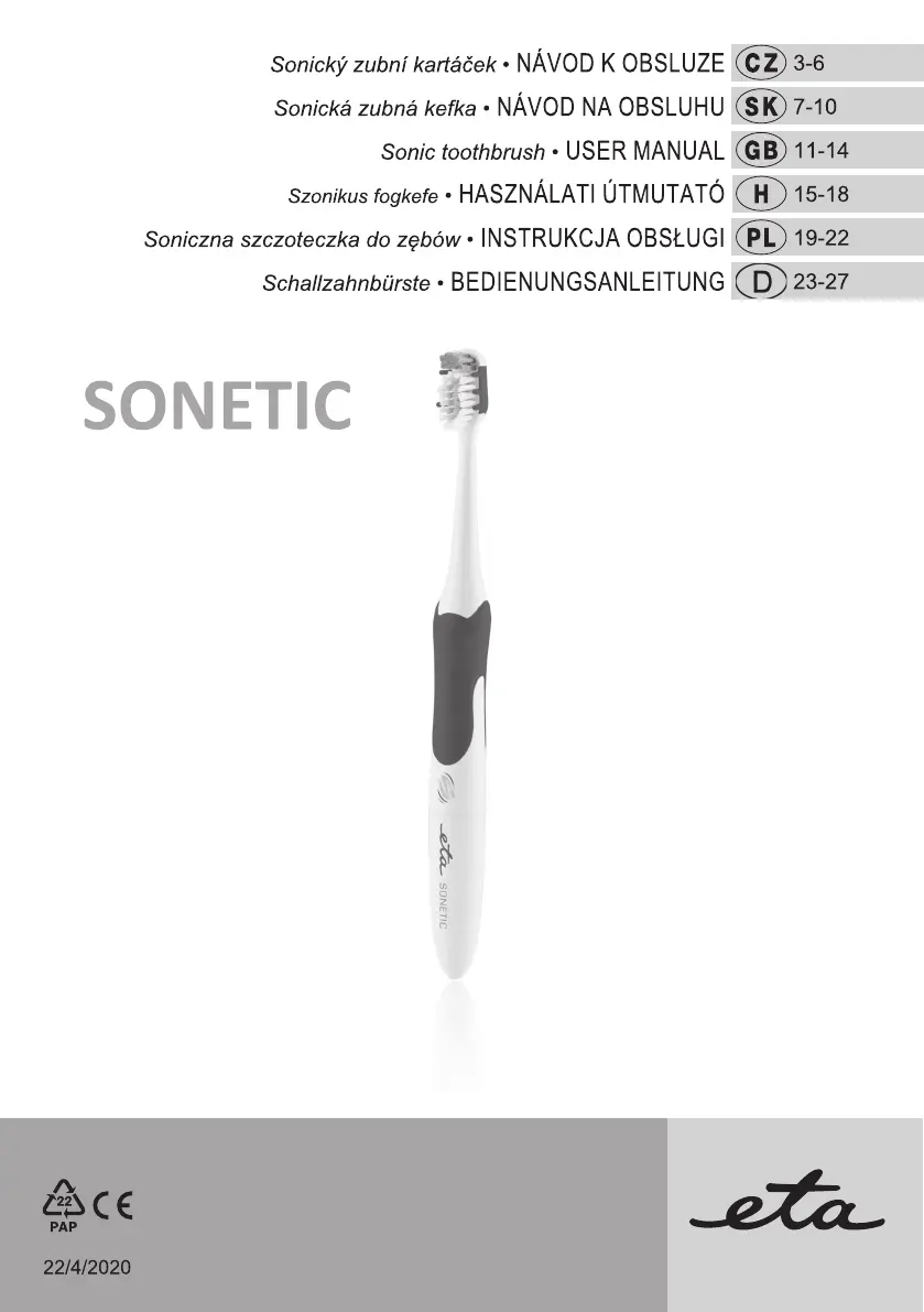 Bekijk gratis de handleiding van ETA Sonetic 0709 90000 (32 pagina’s), behorend tot de categorie Tandenborstel. Deze gids werd als nuttig beoordeeld door 22 mensen en kreeg gemiddeld 4.0 sterren uit 8 reviews. Heb je een vraag over ETA Sonetic 0709 90000 of wil je andere gebruikers van dit product iets vragen? Stel een vraag
