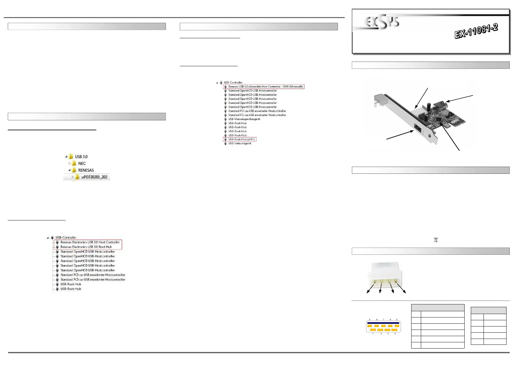 Anschlüsse von 1.1 bis 3.0. Die EX-11081-2 benötigt zusätzlichen Strom vom PC-Netzteil, um