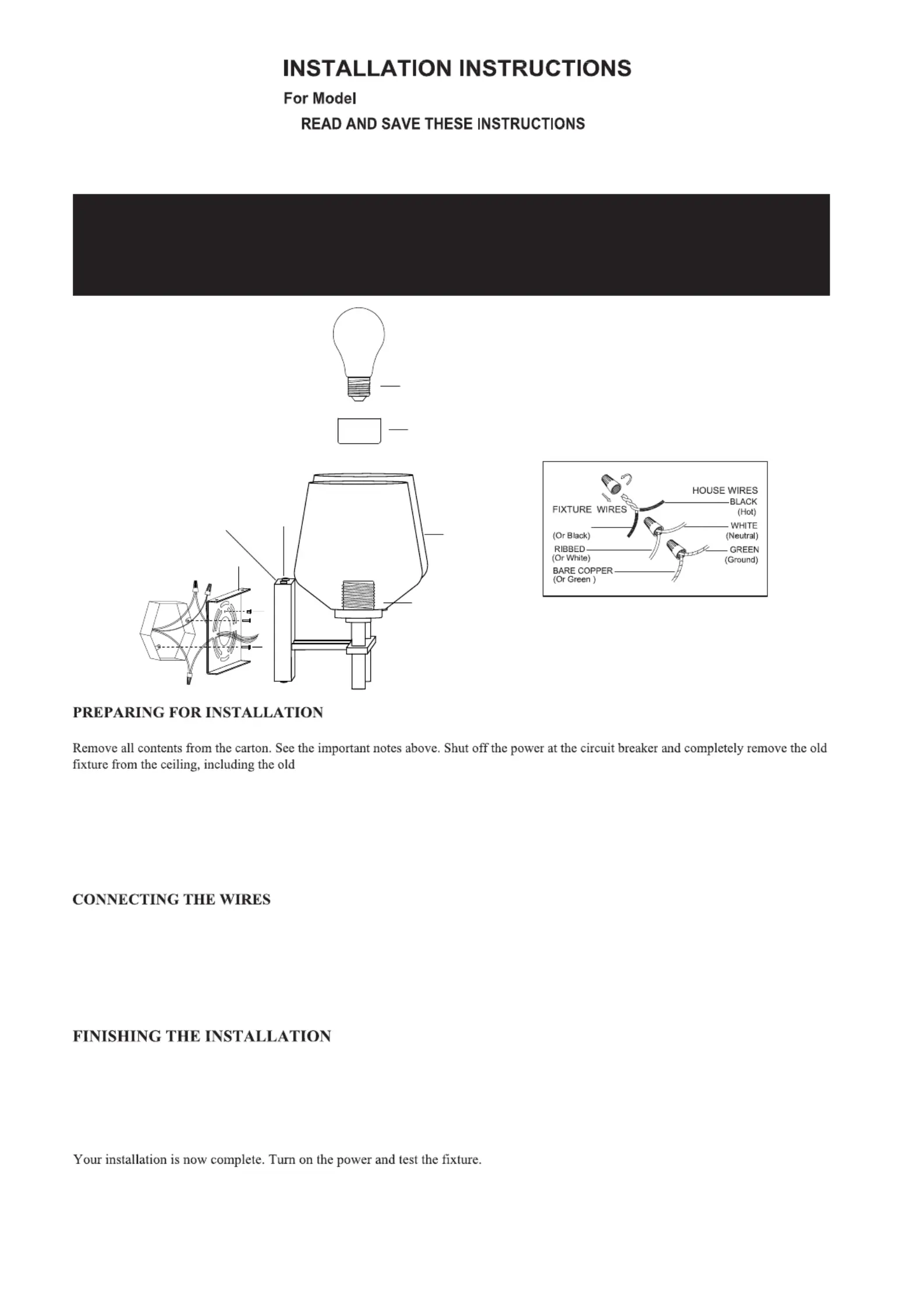 light bulb(s) (not included) in accordance with the fixture’s specifications. Do not exceed the recommended maximum wattage.