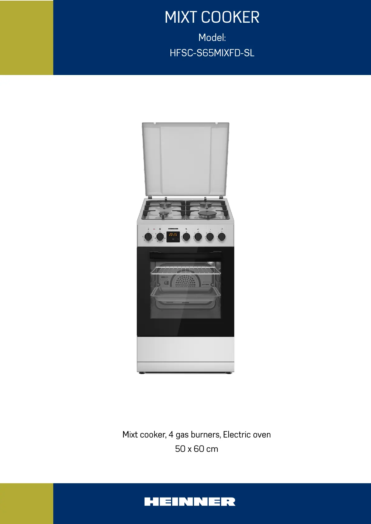 Bekijk gratis de handleiding van Heinner HFSC-S65MIXFD-SL (134 pagina’s), behorend tot de categorie Fornuis. Deze gids werd als nuttig beoordeeld door 11 mensen en kreeg gemiddeld 4.2 sterren uit 2 reviews. Heb je een vraag over Heinner HFSC-S65MIXFD-SL of wil je andere gebruikers van dit product iets vragen? Stel een vraag