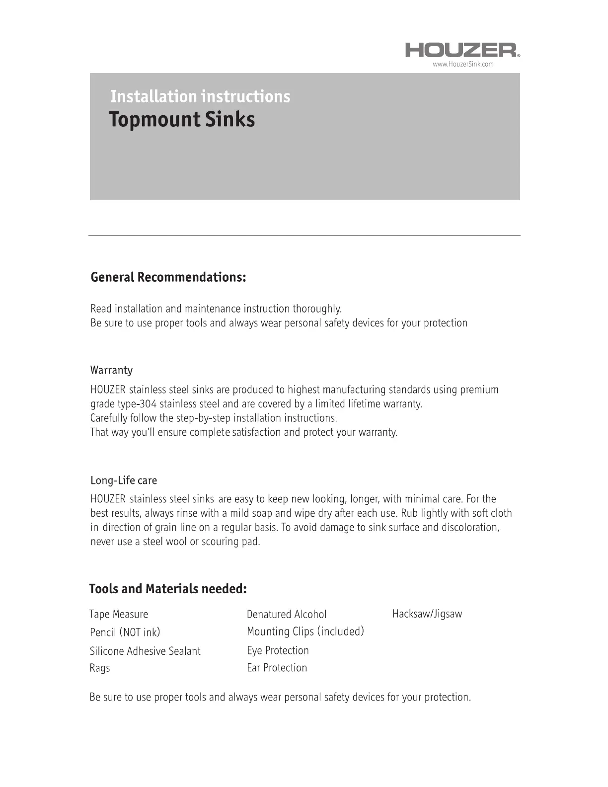 Handleiding Spoelbak Houzer