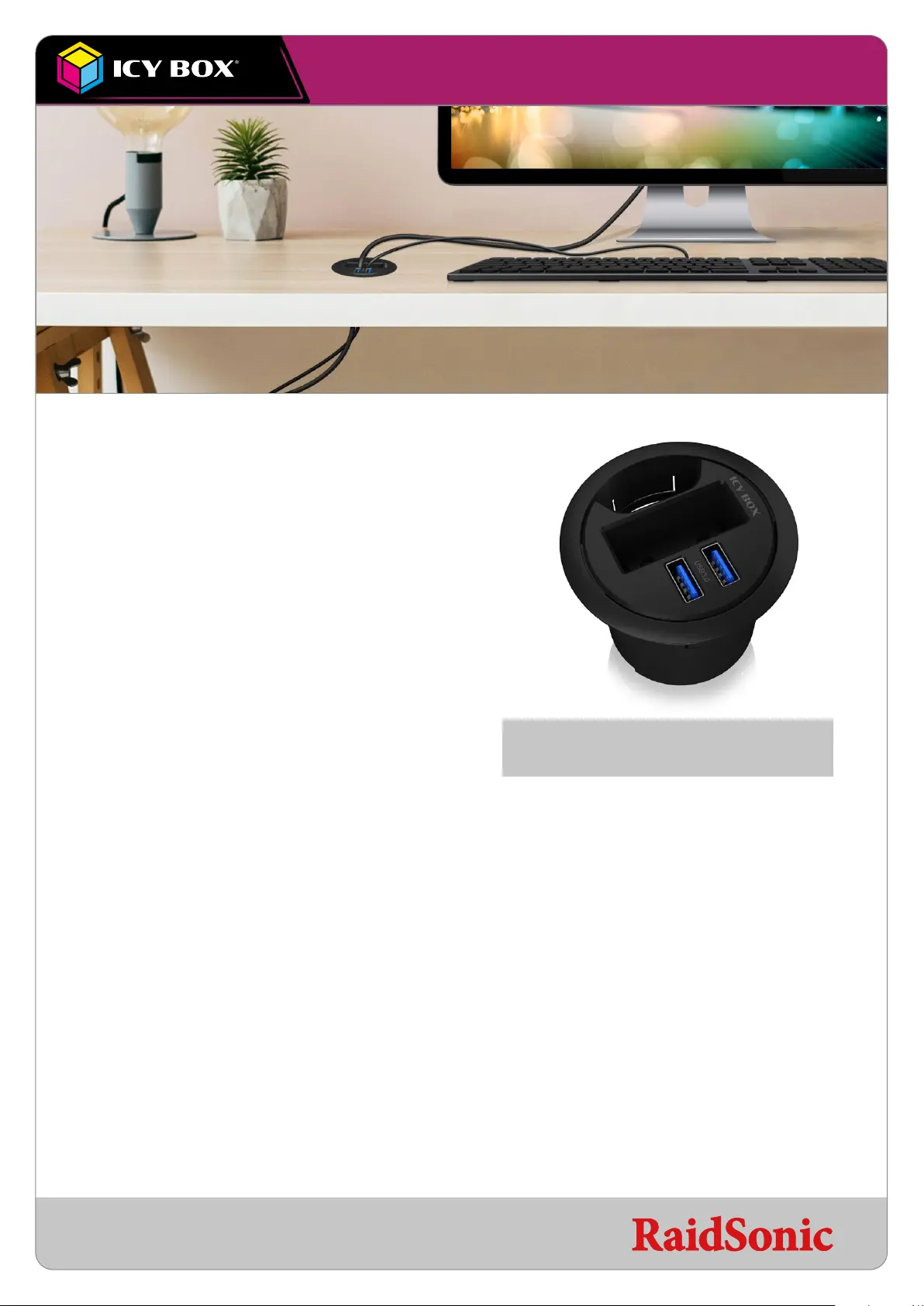 The IB-HUB2201 is made for desks with 60 mm cable grommets. It fits easily into existing holes without using a tool. Besides the HUB-functionality the cables still fit