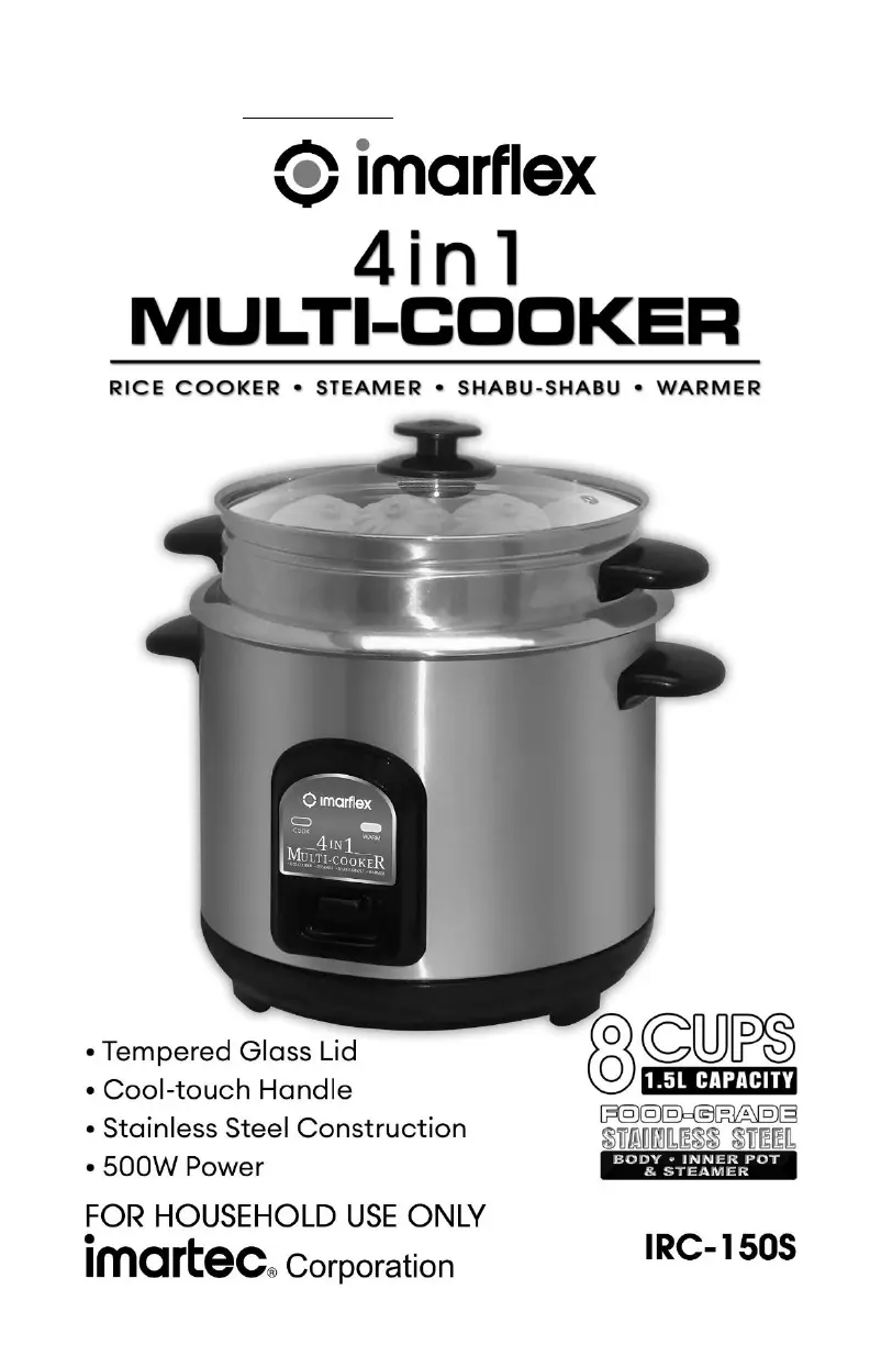Bekijk gratis de handleiding van Imarflex IRC-150S (4 pagina’s), behorend tot de categorie Multi Cooker. Deze gids werd als nuttig beoordeeld door 21 mensen en kreeg gemiddeld 4.8 sterren uit 2 reviews. Heb je een vraag over Imarflex IRC-150S of wil je andere gebruikers van dit product iets vragen? Stel een vraag
