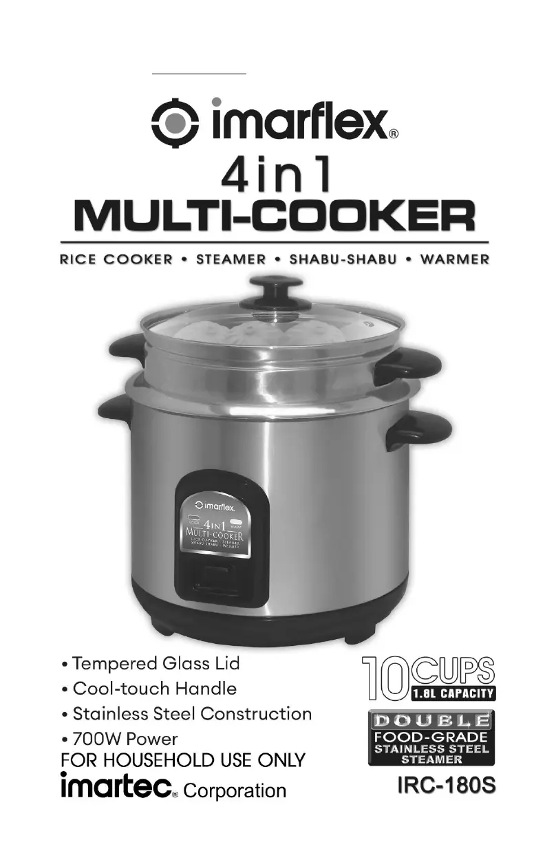 Bekijk gratis de handleiding van Imarflex IRC-180S (4 pagina’s), behorend tot de categorie Multi Cooker. Deze gids werd als nuttig beoordeeld door 24 mensen en kreeg gemiddeld 4.6 sterren uit 5 reviews. Heb je een vraag over Imarflex IRC-180S of wil je andere gebruikers van dit product iets vragen? Stel een vraag