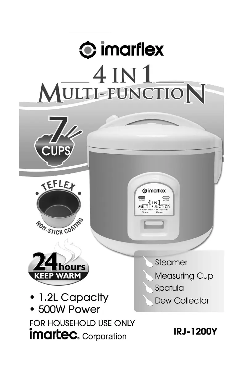 Bekijk gratis de handleiding van Imarflex IRJ-1200Y (4 pagina’s), behorend tot de categorie Rijstkoker. Deze gids werd als nuttig beoordeeld door 2 mensen en kreeg gemiddeld 4.2 sterren uit 2 reviews. Heb je een vraag over Imarflex IRJ-1200Y of wil je andere gebruikers van dit product iets vragen? Stel een vraag