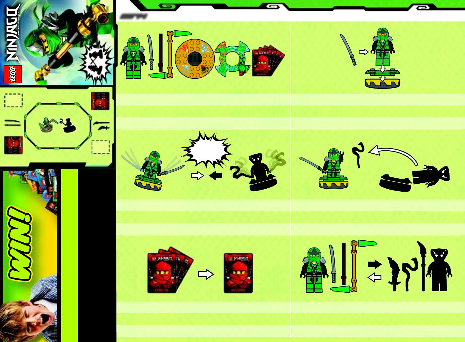 Choose a Ninjago character, three weapons, a spinner, a crown and four battle cards.