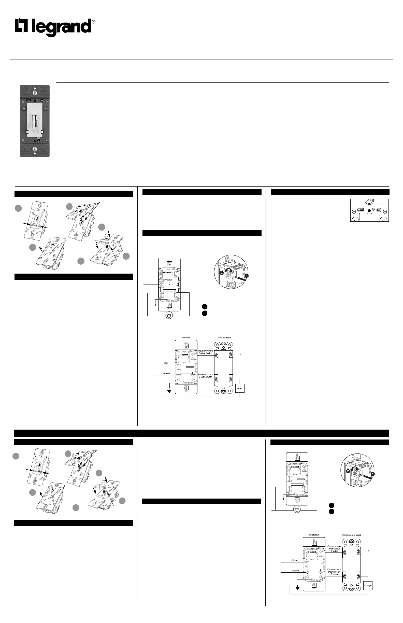 Toggle Universal Dimmer Incandescent, ELV, Halogen: 700W; CFL/LED: 450W (4.5A); MLV: 500VA; EFL: 5.5A