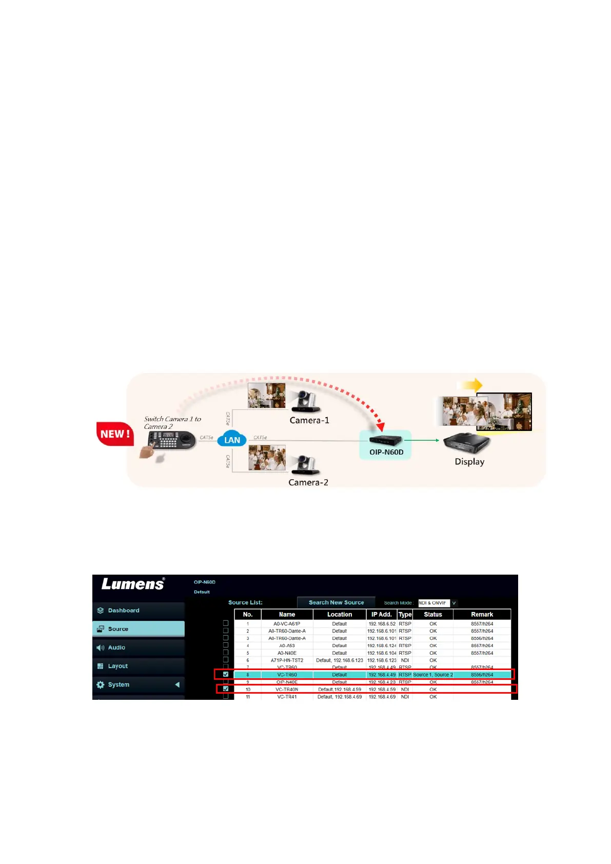 This guide explains how to switch between different camera sources on the OIP-N60D