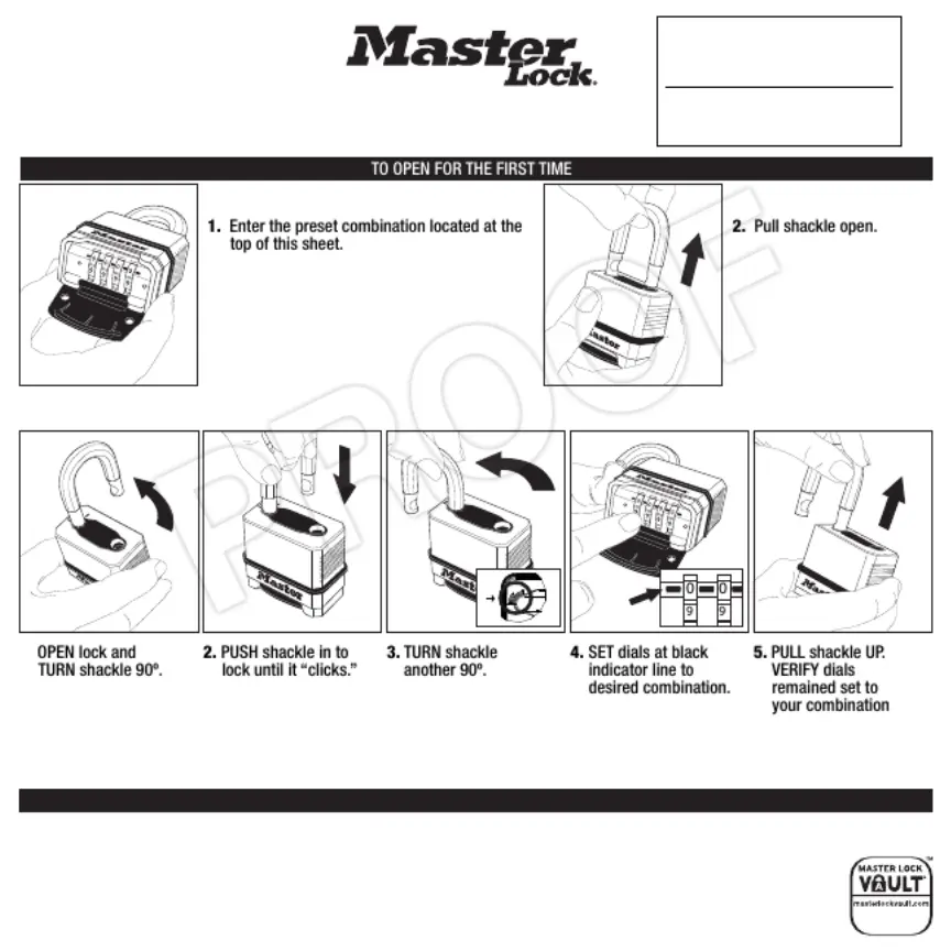 TO LOCK: Close the shackle and SCRAMBLE THE DIALS.