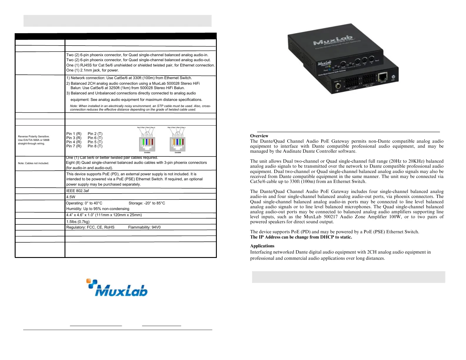 TheDante/QuadChannelAudioPoEGatewayincludesfoursingle-channelbalancedanalog