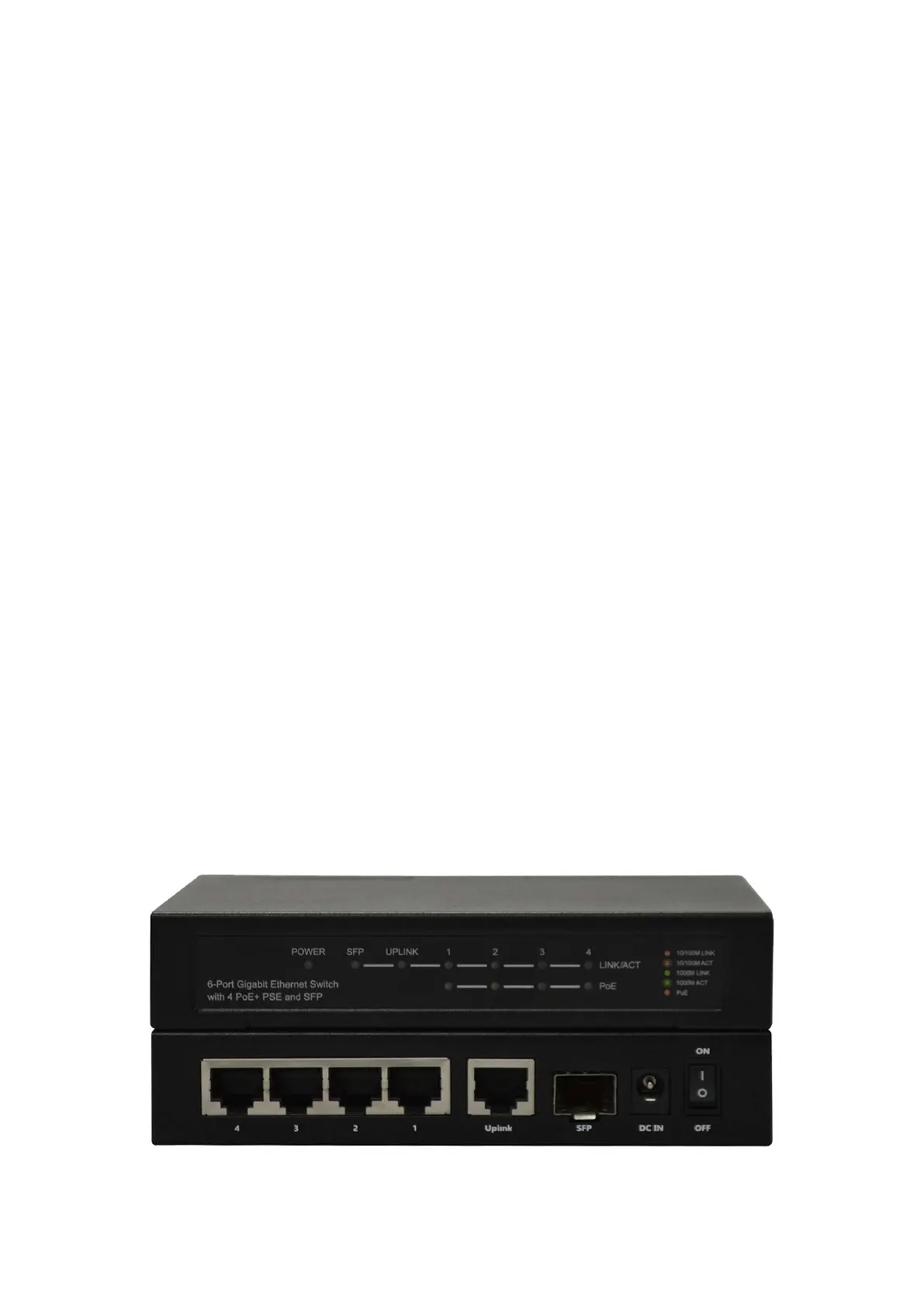 This is a 6-port Gigabit Ethernet Switch with 4 PoE+ PSE ports and 1 dual-speed SFP slot.
