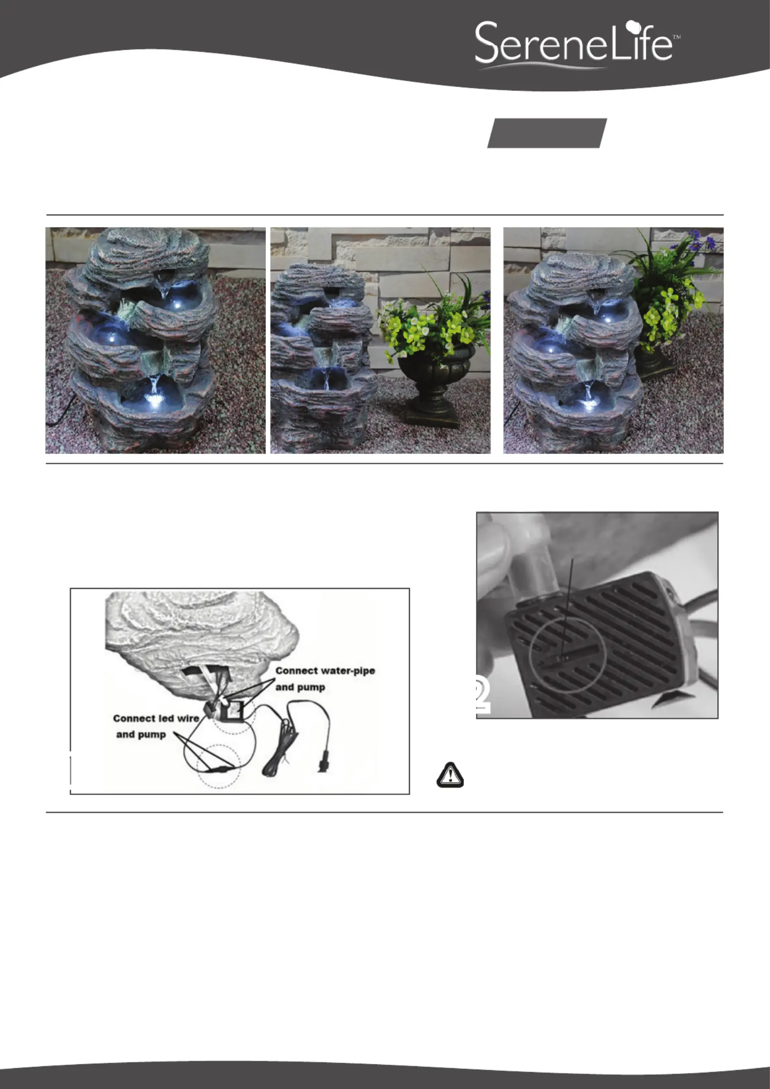 • Check the water level in the fountain. Running the pump without sucient water can damage the pump.