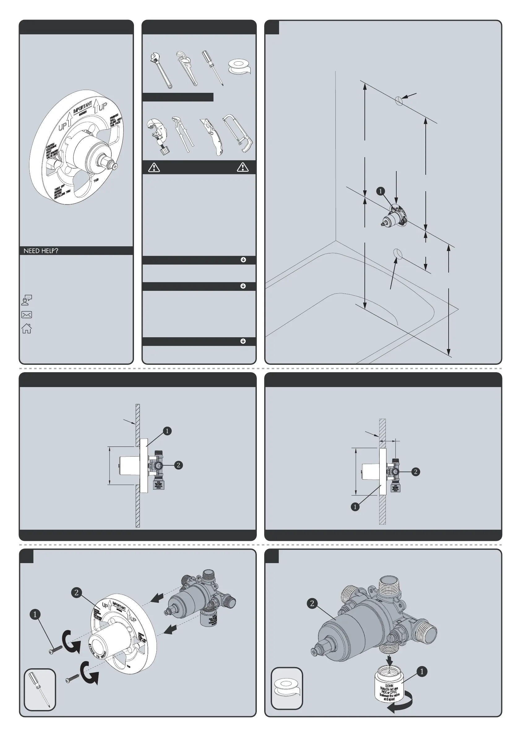 (1) correctly in the wall with the “UP” pointing up. The 8” minimum from the valve body to the tub spout is