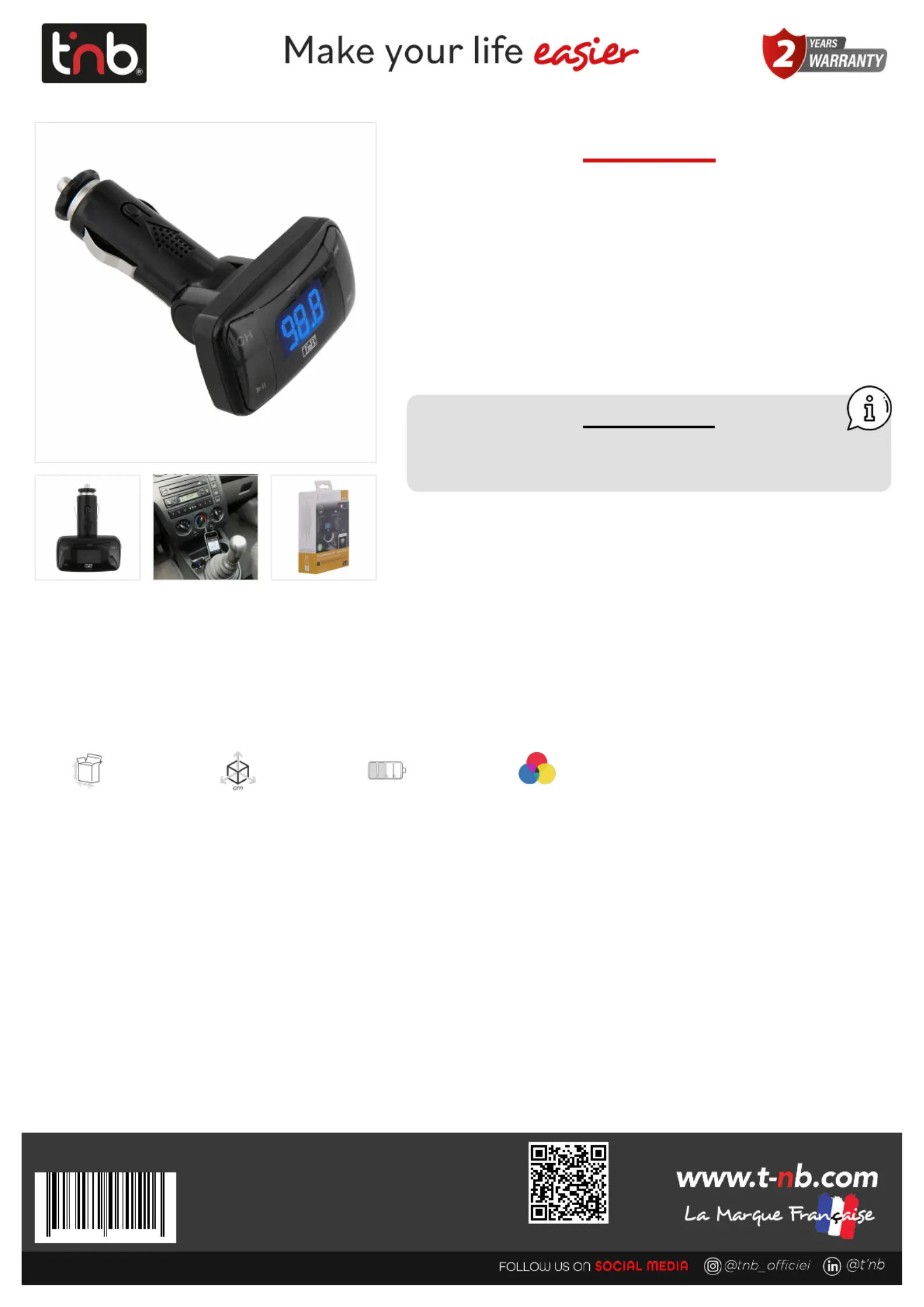 This transmitter allows you to listen to your music and enjoy your calls directly on your