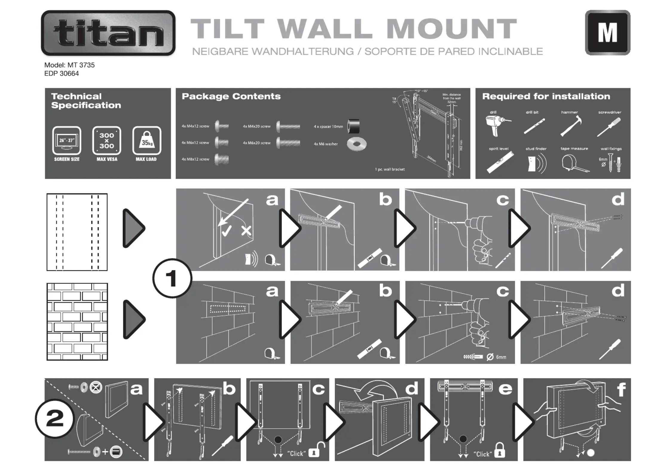 Bekijk gratis de handleiding van Titan MT 3735 (1 pagina’s), behorend tot de categorie Wandsteun. Deze gids werd als nuttig beoordeeld door 17 mensen en kreeg gemiddeld 4.0 sterren uit 2 reviews. Heb je een vraag over Titan MT 3735 of wil je andere gebruikers van dit product iets vragen? Stel een vraag