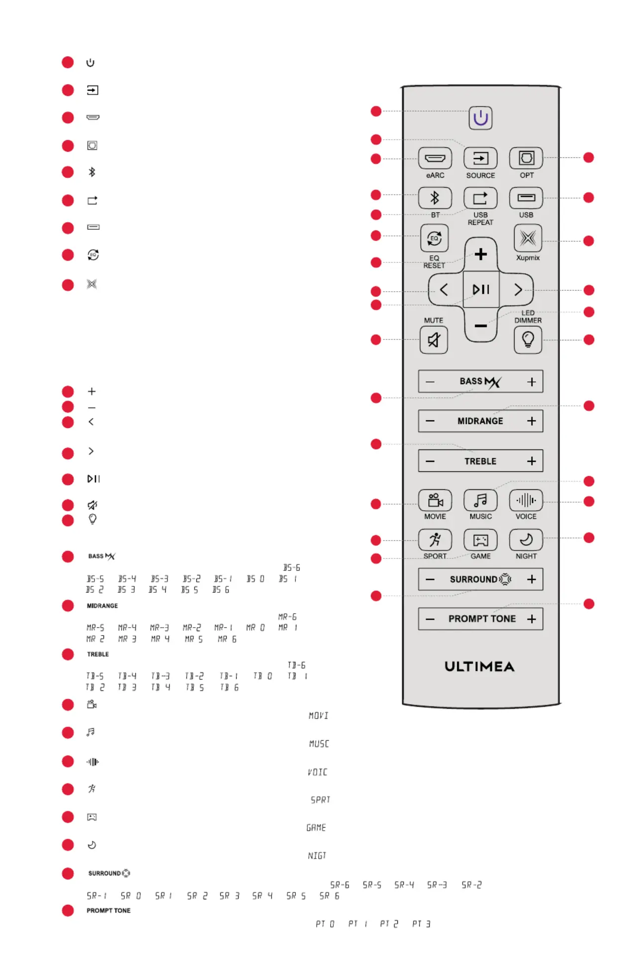 Press to adjust surround sound level, the display will show: “ ”, “ ”, “ ”, “ ”, “ ”,