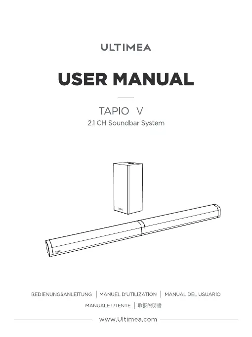 Bekijk gratis de handleiding van Ultimea Tapio V (20 pagina’s), behorend tot de categorie Soundbar. Deze gids werd als nuttig beoordeeld door 2 mensen en kreeg gemiddeld 4.2 sterren uit 6 reviews. Heb je een vraag over Ultimea Tapio V of wil je andere gebruikers van dit product iets vragen? Stel een vraag