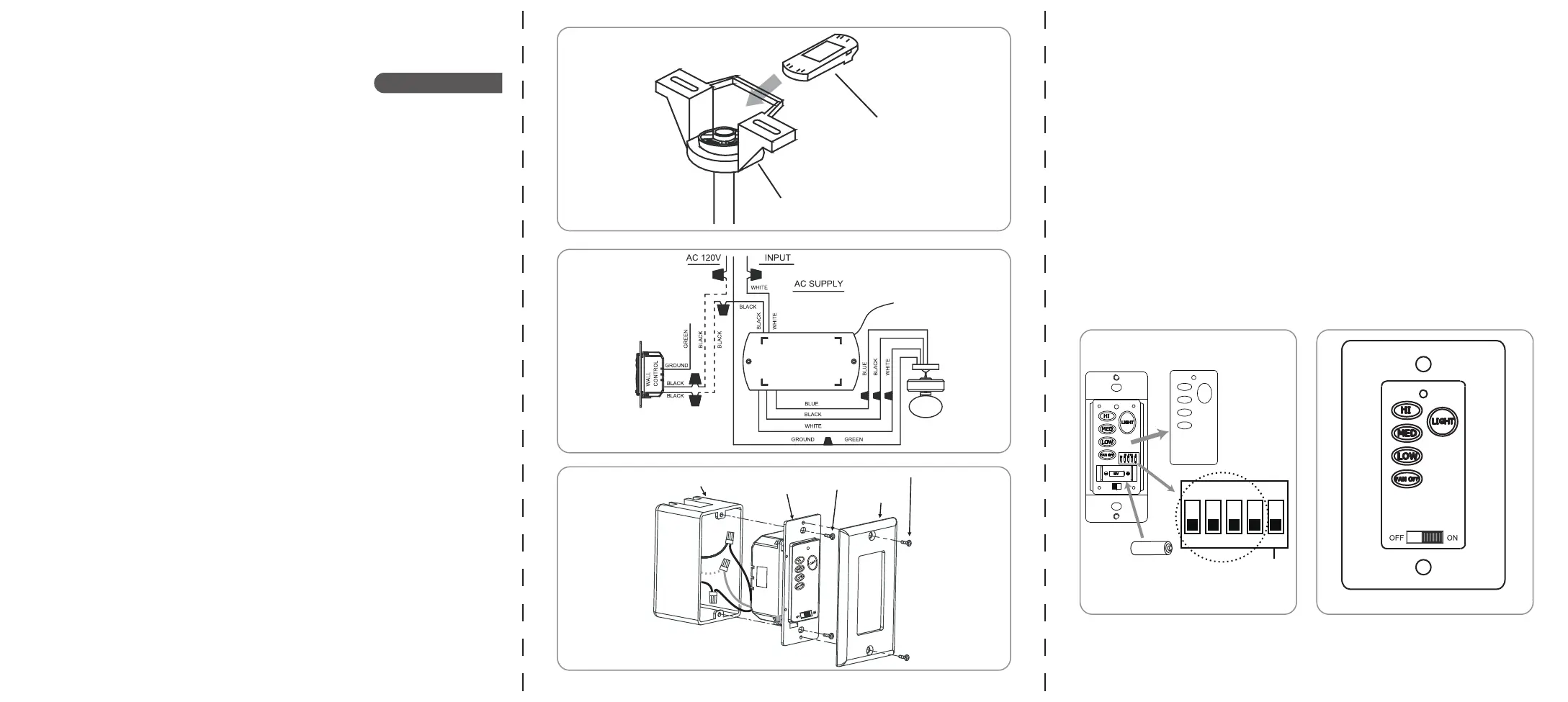 receiver. Connect the BLACK wire (Hot) from the ceiling outlet box to the BLACK wire marked “AC in L”